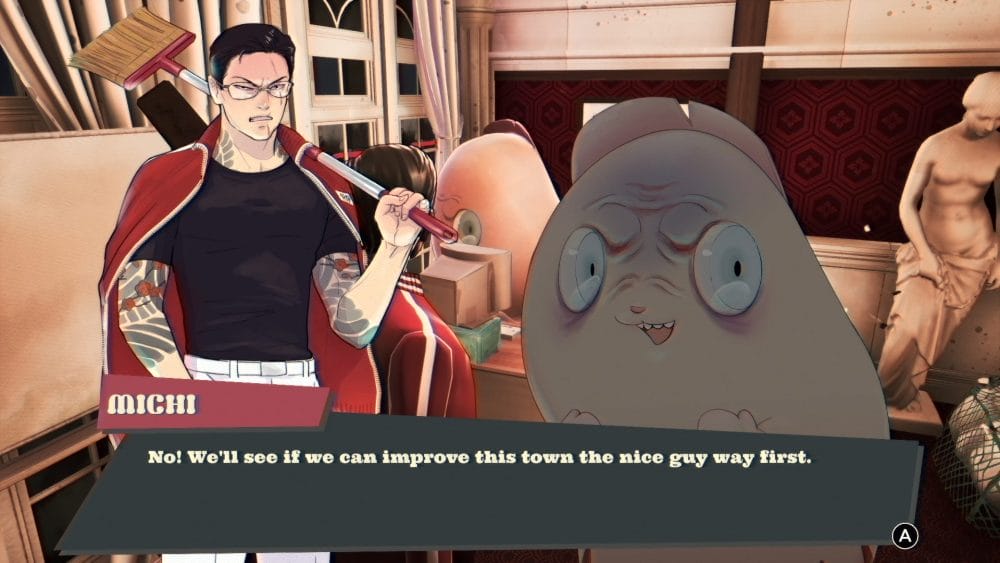 In keeping our Promise Mascot Agency review spoiler free, all we’ll include is there’s quite a turning point in the game that may seem predictable but also welcome. Kaizen Game Works has managed to at times make the game feel a bit cozy while still discussing the yakuza lifestyle and how family really cares for each other. This turning point in the game also impacts the game play loop. In fact, it may even impact the way you prioritize your day in game. What is a bit fun, is the fact that each mascot you recruit who gets their own merch. This means you’ll be re-exploring the map and finding areas you may have missed. Fans of Kaizen’s previous work, Paradise Killer, will enjoy finding a few reminders of Paradise Killer while exploring Kaso-Machi in full.