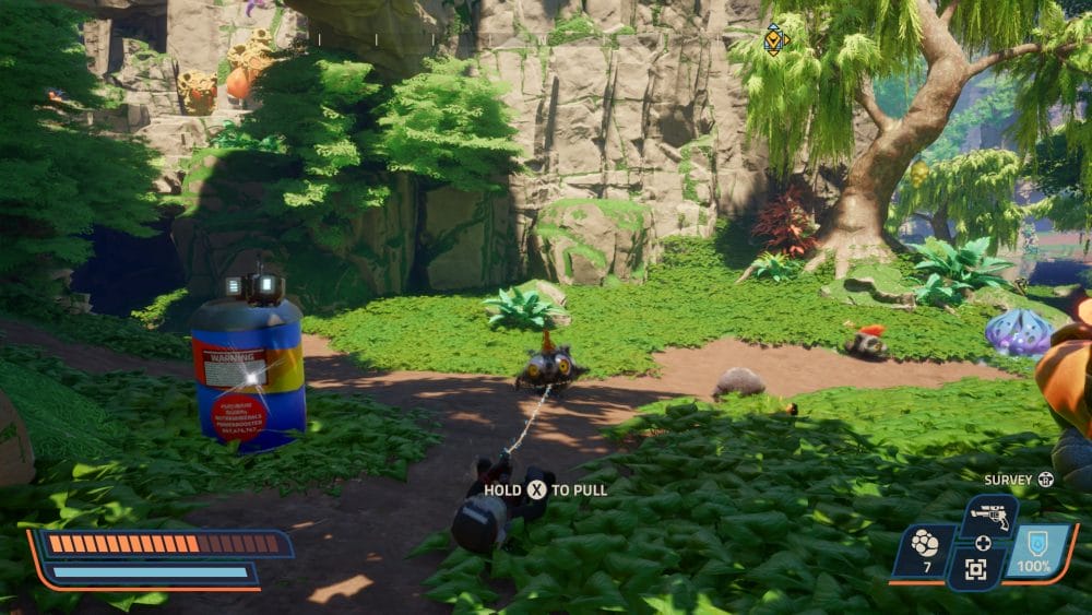 These little mushroom fellas are super easy, they don’t attack and just inflate when you’re nearby. So just lock on and lasso them by holding down your whip button then reel them in!
