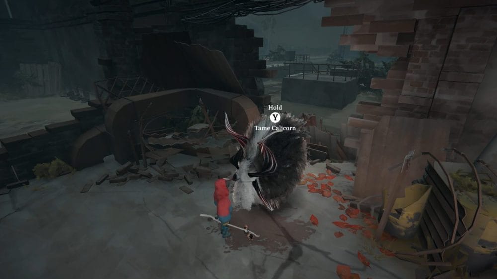 Right after taming the fourth Calicorn, turn around to see a wall that can be pushed by you and your herdling. Approach it, and your new addition will help lower the wall for the rest of your Calicorns to come through.