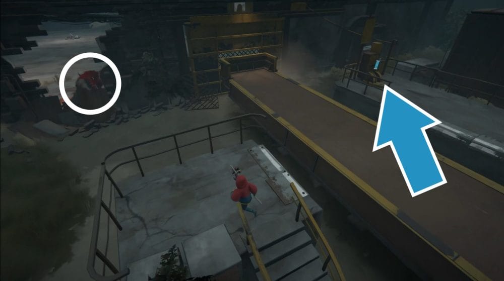 Run down to the other end, and you’ll see the trapped Calicorn run into some trash to hide. Head back up towards the gate and approach the blue bar to push it open.