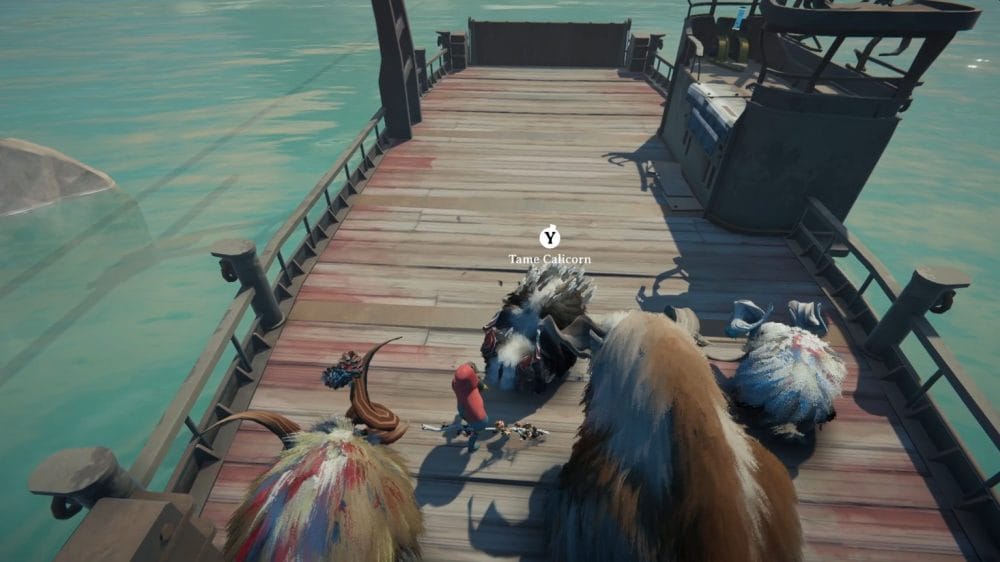 This gets the ferry moving, and it will move to the dock, lowering a bridge so you and your herdling can board. But there just so happens to be a Calicorn waiting on the ferry! (How long have they been stranded there?!)