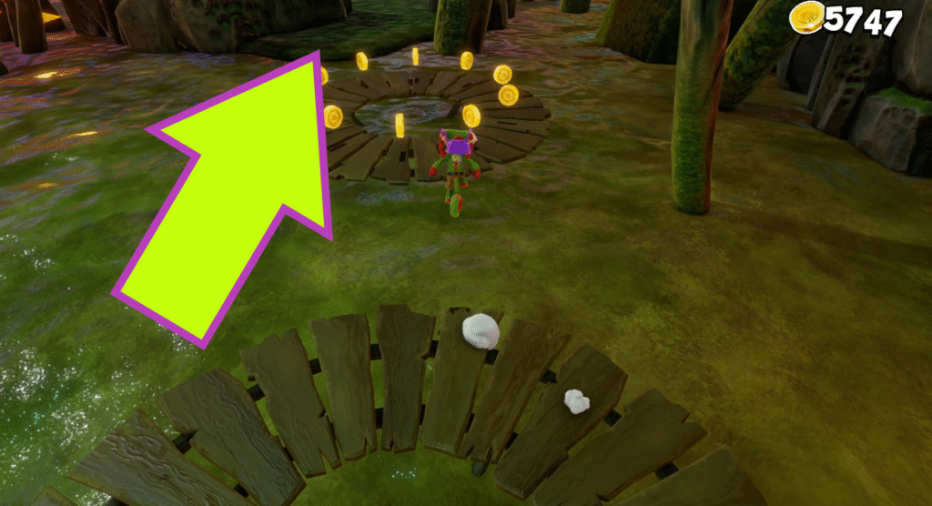 Continue along this route, crossing some murky water using bouncy mushrooms. Before reaching the other side of the water, look to your left to see a quartet of Quills on another bouncy mushroom.
