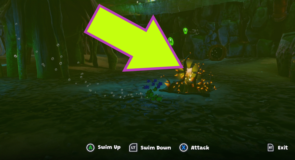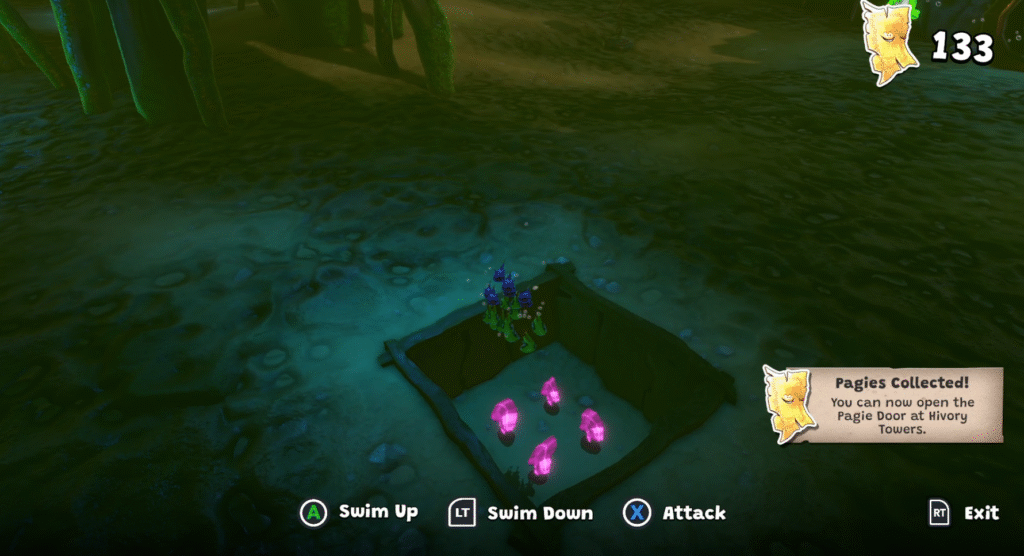 Swim down to the bottom and locate some spiky thorns holding a Pagie prisoner. Attack the thorns to clear them and find four Quills hidden underneath them and the Pagie.