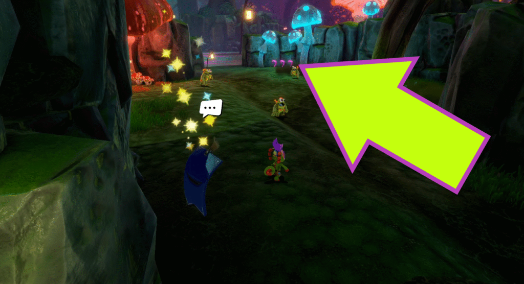 Return to the Mark fast travel point in front of the large mushroom. Look among the rocks near a sparkling mushroom to find three more Quills.