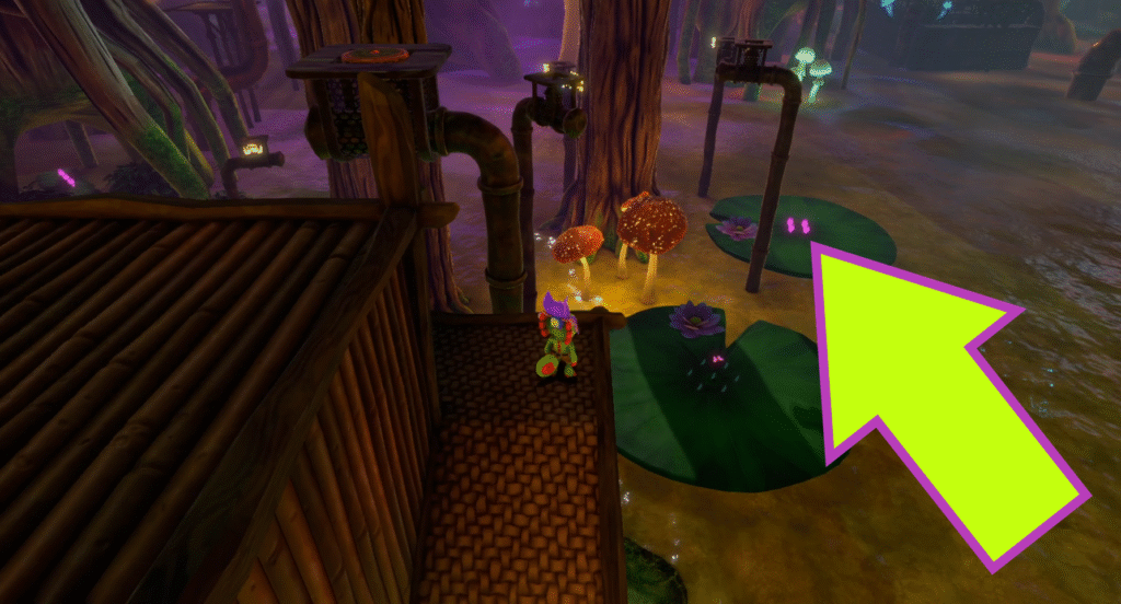 Cross the water and hop out the other side to find Rextro and his arcade machine! Tucked behind the machine are four Quills to nab.
