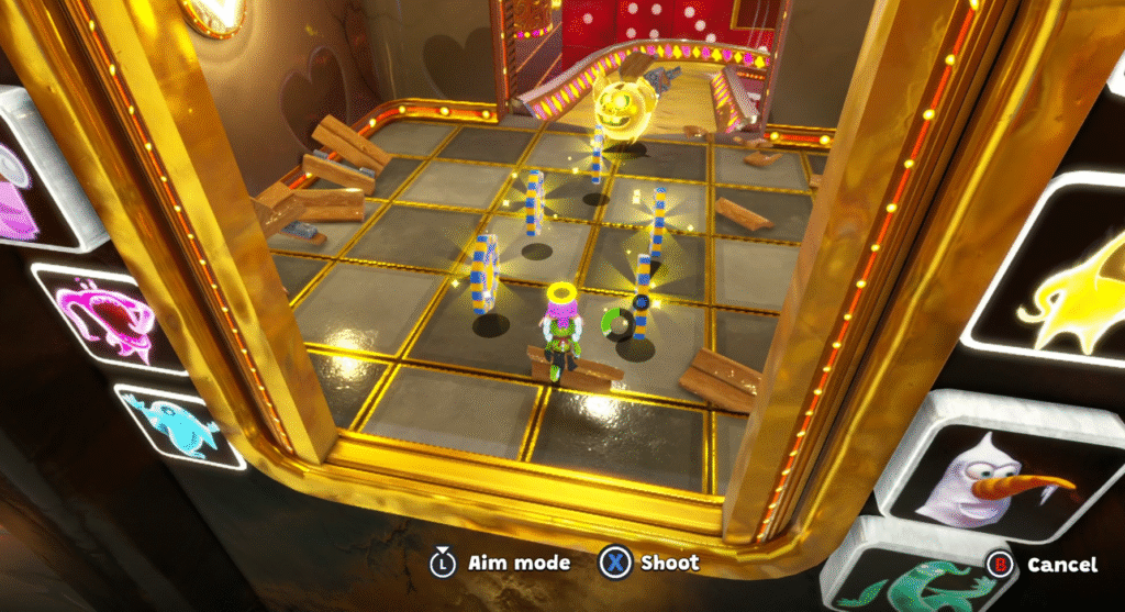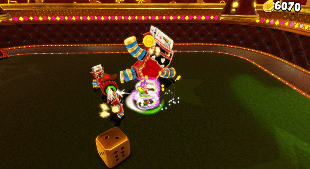Things work a little bit differently in Capital Cashino, as the familiar-looking casino teller Cashital Zee is eager to tell our dynamic duo. There are still a handful of Pagies and eight Pagie Pieces to be found throughout the level, but what you will be collecting in their stead is Cashino Tokens!