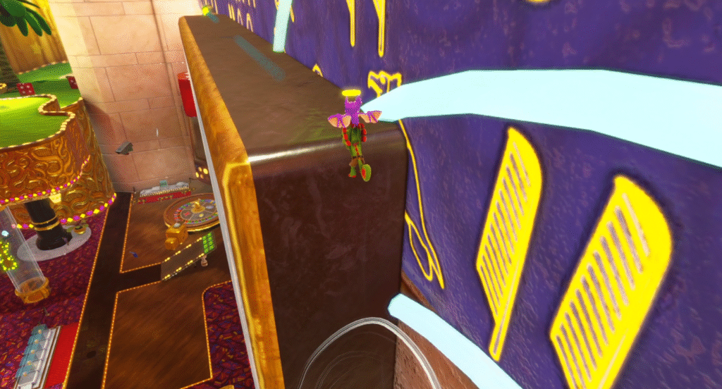 Run along the narrow ledge near the slot machine you just beat and look for a single casino chip hanging off the edge. Roll over it or Buddy Slam it to make a Pagie Piece pop out, ready to grab.