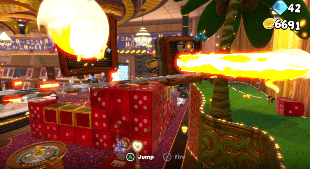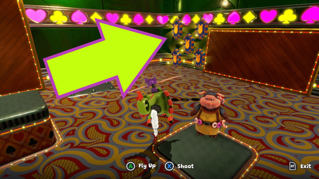 You have probably noticed several out-of-order slot machines around the level. Well, as the helicopter, you can shoot at these to destroy them, revealing a single Cashino Token within each one. The first is on the roof of the house of cards building, with the second on the narrow ledge where you got the last Pagie Piece.