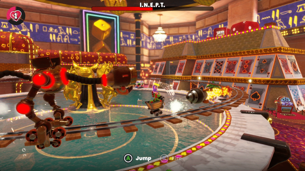 At the end of your first attempt at Kartos’ minecart challenge, you’ll be attacked by the boss of Capital Cashino, I.N.E.P.T.