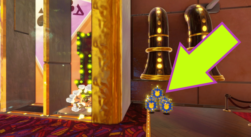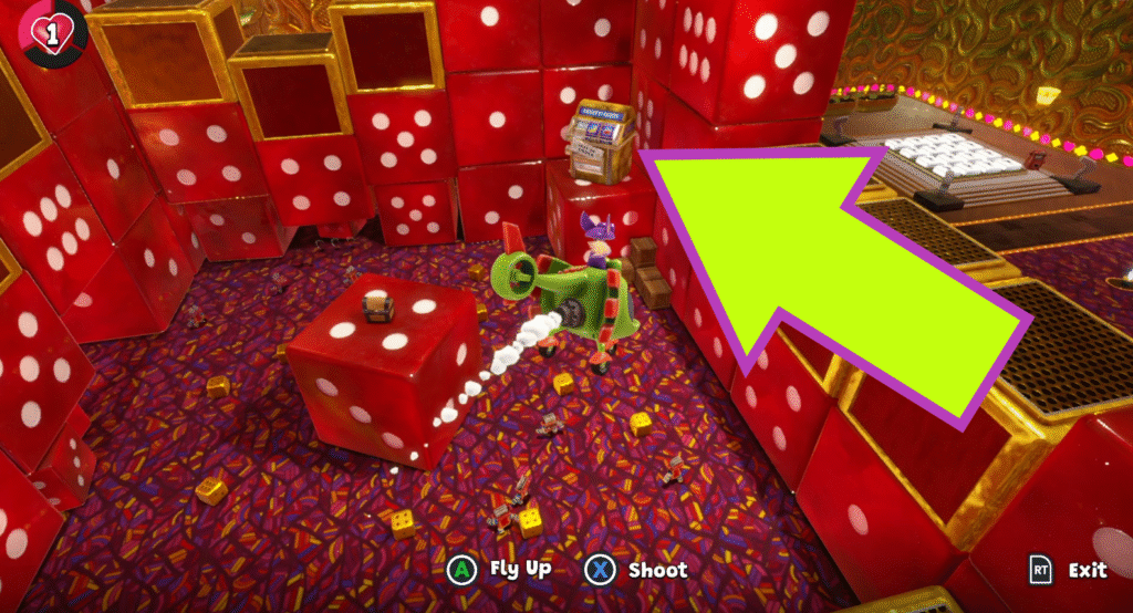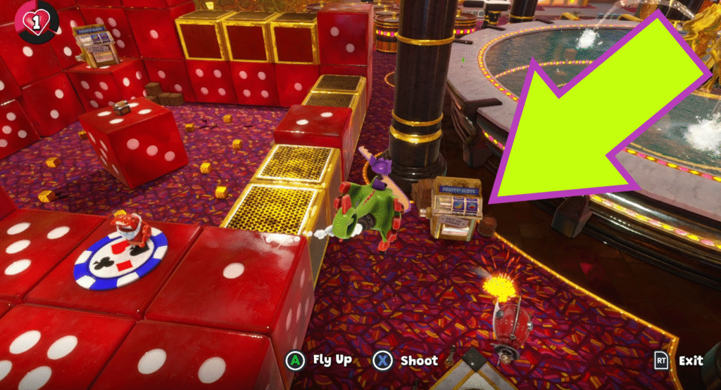 The ninth out-of-order slot machine is found in a little room at the back and near the ceiling of Rextro’s area. Fly inside to destroy it. The last slot machine and the last of these loose Cashino Tokens are found near the beginning of the level, tucked into the corner by the house of cards building.