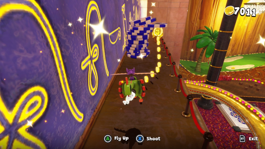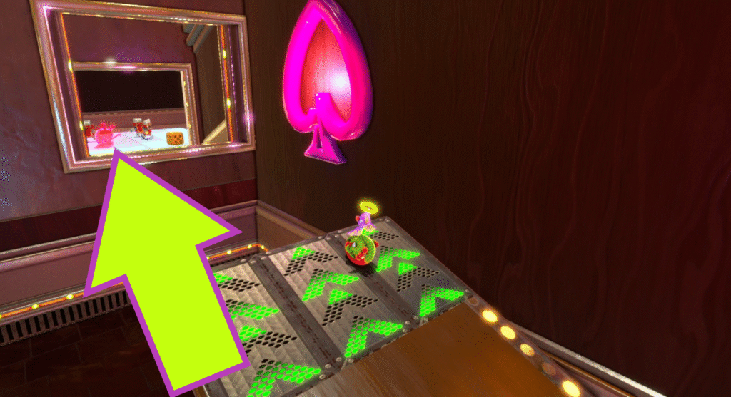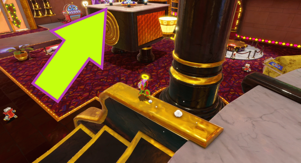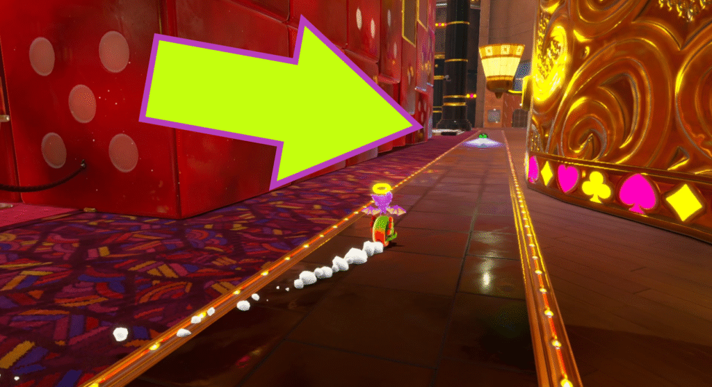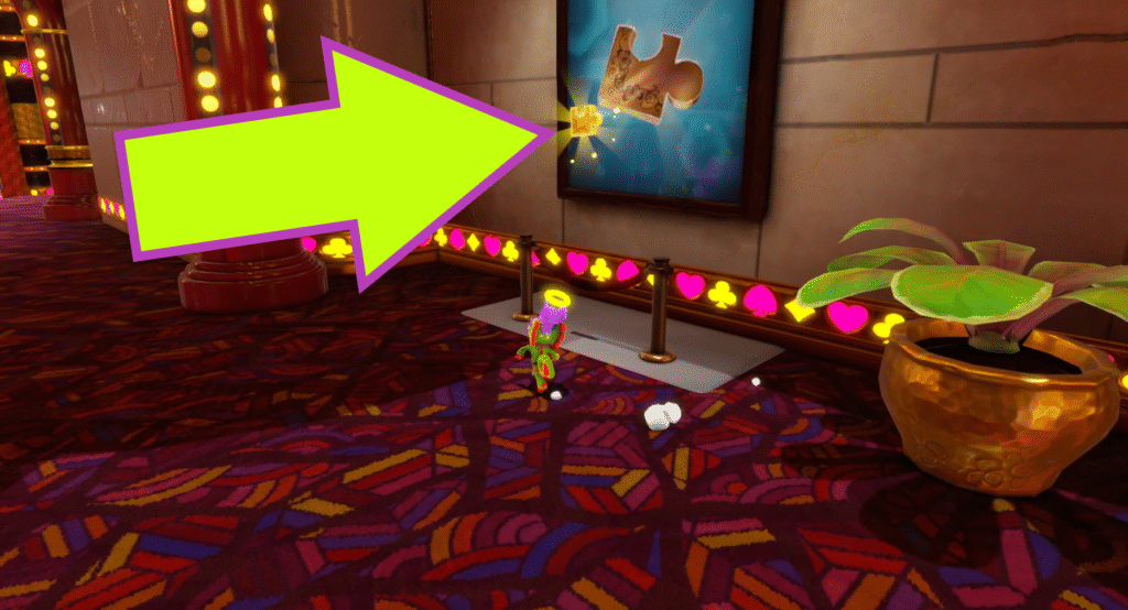 Continue past the portrait and go left around the corner back towards the beginning of the level, where the casino teller Cashital Zee waits. Smash the statue of the Coinelius and follow the coin path back to the stacks of casino chips. At the top of the tallest one is another Pagie Piece.