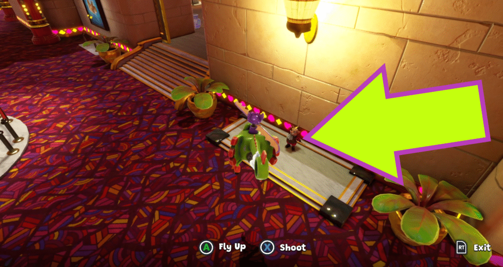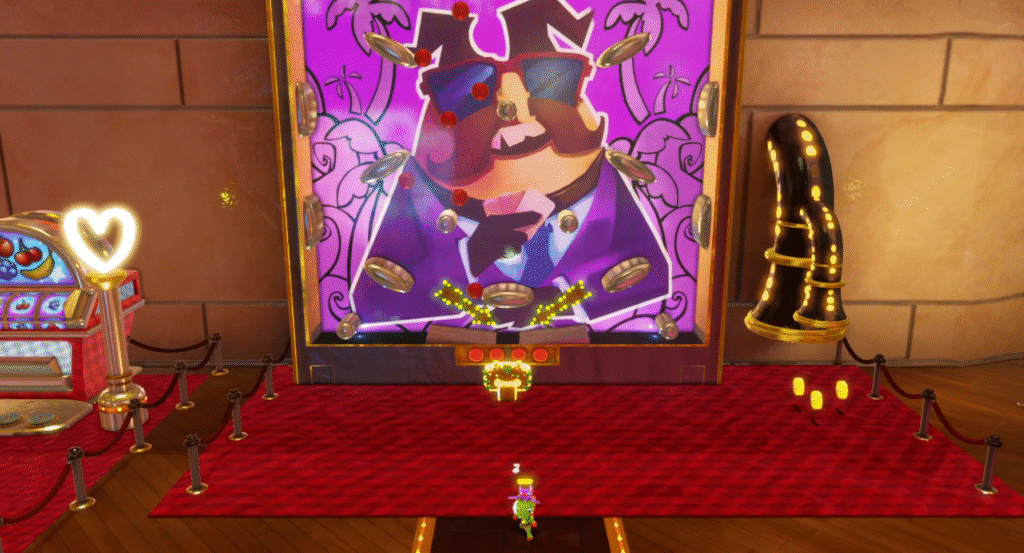 Continue down this hallway, and you’ll spot Rextro and his Arcade Machine on your right. Next to him is a slot machine, which you need to win to earn the Play Coin to play Rextro’s minigame. Pull the lever to get the slots rolling, and then Buddy Slam on the buttons to stop the slots on the portrait of Yooka and Laylee.