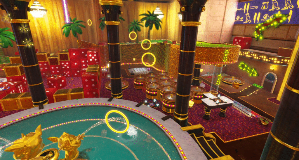 Make your way up onto the large red dice and speak to the one-armed bandit to start their traversal challenge. You need to use air vents to pass through five hoops before time runs out. Success is rewarded with five Cashino Tokens.