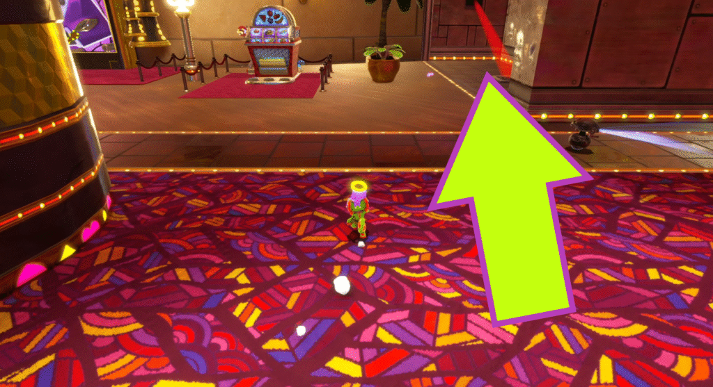 Follow the main path around the large red dice to spot a Pagie Piece hovering in the air, surrounded by a ring of casino chips on the floor. If you approach the Pagie Piece normally, the chips rise to block you from reaching it.
