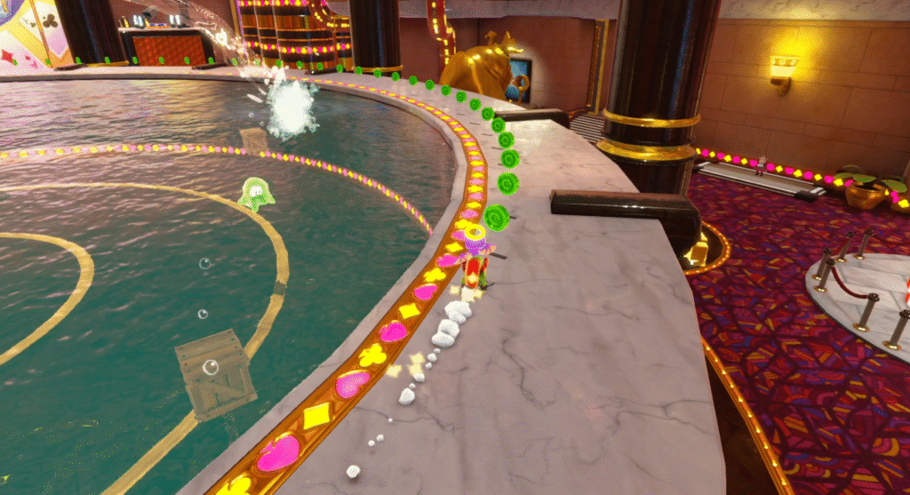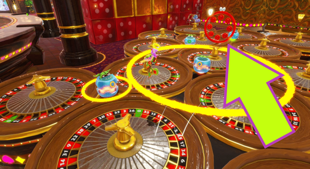 Return to the fountain steps and get over onto the raised Roulette wheels on the left side this time. On top of here is a red Q.U.I.D.D.S challenge hoop to contend with. Jump through it and collect all eight red Q.U.I.D.D.S coins before time runs out to get five Tokens.