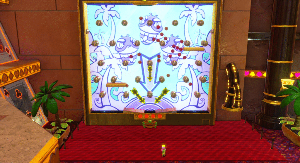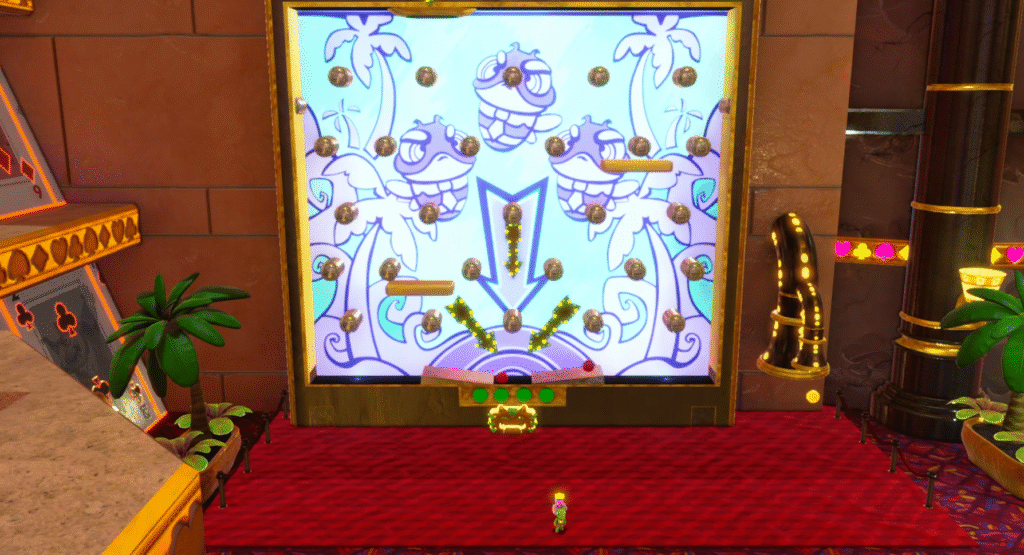 To the left of the slot machine is a large pachinko minigame against the wall. Interact with it to release several balls in the hopes that four fall into the hole in the middle at the bottom. Once you see all four green lights at the bottom, you will win five more Tokens.