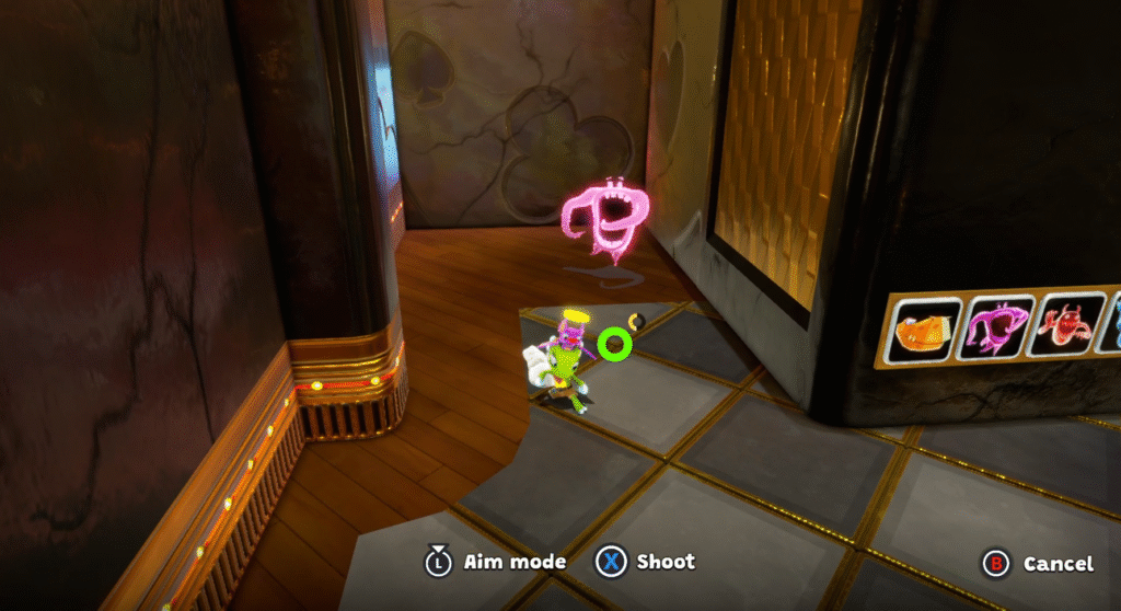 The next two sets of five Cashino Tokens are earned from the same minigame. Drop down onto the narrow ledge on the other side of where you found the last Ghost Writer and use Laylee’s Sonar Shot on the moving invisible platform so you can ride it across to the start of the golf course minigame.